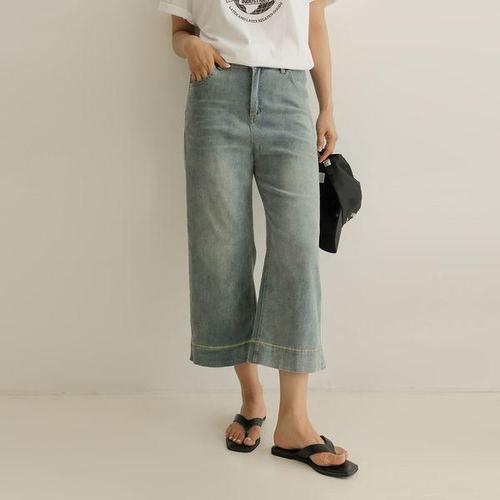 [옷자락]여자 빈티지 8부 워싱 와이드 트렌디 데님팬츠