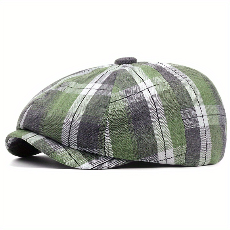 TEMU 남성용 우아한 체크무늬 뉴스보이 캡 - 녹색 & 흰색 체크무늬 패턴, 조절 가능한 스냅백, 가벼운 폴리에스터, 야외 스포츠 및 캐주얼 착용에 완벽, 캐주얼 헤드웨어 | 체크무늬 캡 | 가벼운 캡, 체크 무늬 베레트, 남성용 모자, 남성용 베레트, 남성용 모자