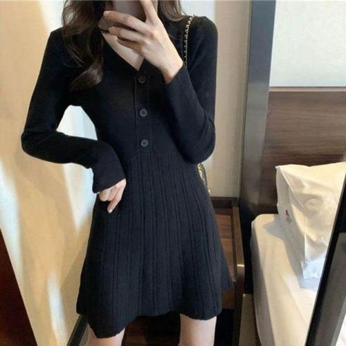 cammello 브이넥 슬림핏 골지 플레어 미니원피스 긴팔 A라인 드레스 하객룩
