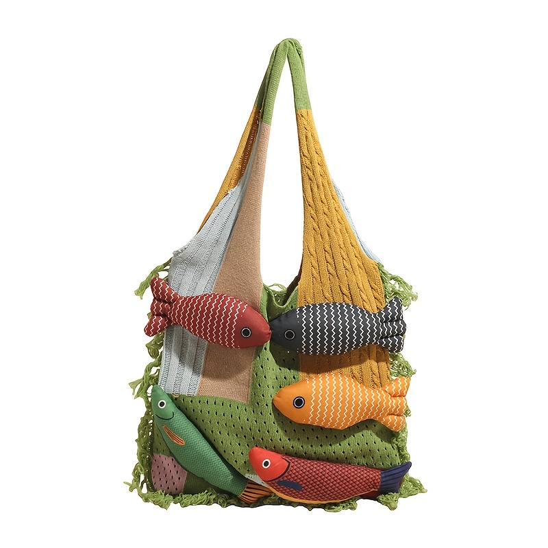 TEMU 2026 신상 니치 다용도 패션 패치워크 개성 피쉬 핸드백 니트 토트백, 대학생용 대용량 여성 가방, 수업 및 출근용