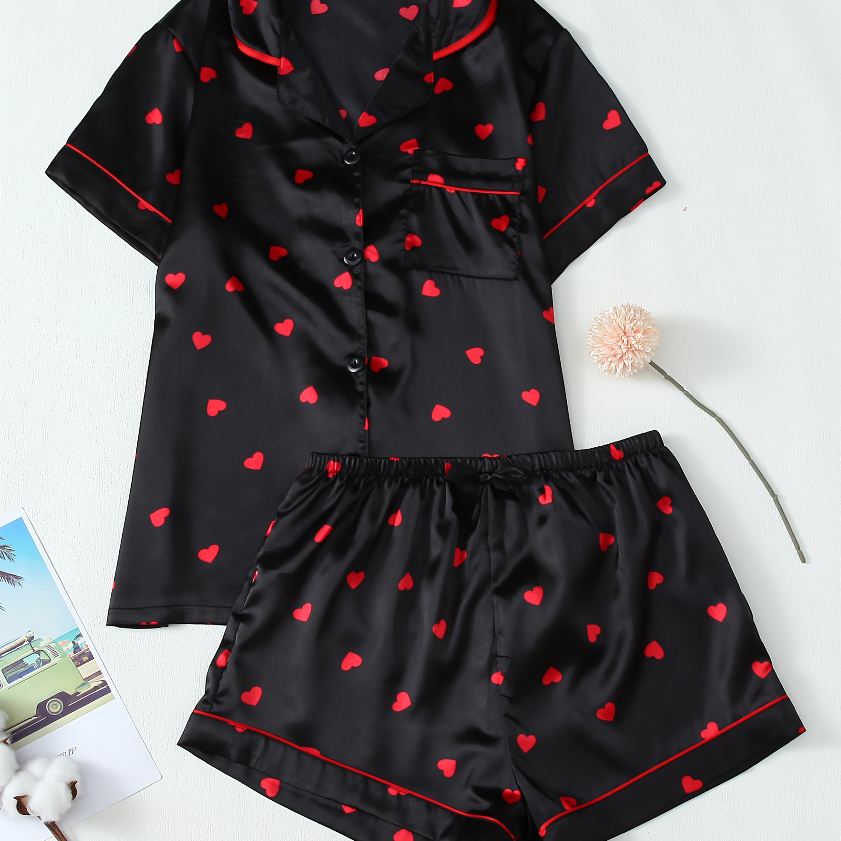 TEMU 여성용 블랙 하트 프린트 반팔 파자마 세트 - 레드 액센트가 있는 캐주얼 스타일, 모든 계절의 편안함, 반바지와 상의, 캐주얼 착용|즐거운 프린트|반바지와 상의 세트