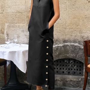 TEMU 1개 우아한 하이넥 옆 단추 디테일 슬리브리스 튜닉 원피스, 단색 폴리에스테르, 성인용 포켓이 달린 올 시즌 짜임 원피스