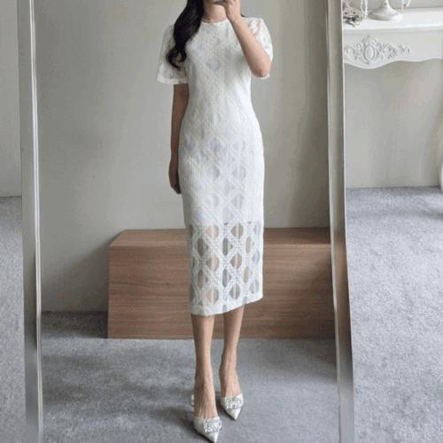 [엘린무드]컴투미 자수 스팽글 다이아 레이스 시스루 퍼프 반팔 H라인 원피스(2COLOR)