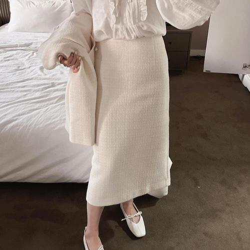 여성 뒤트임 앙고라 밴딩 롱스커트 H라인 니트 데이트캐주얼룩 데이트 예쁜 솔리드 패션 밴스커트 밴롱
