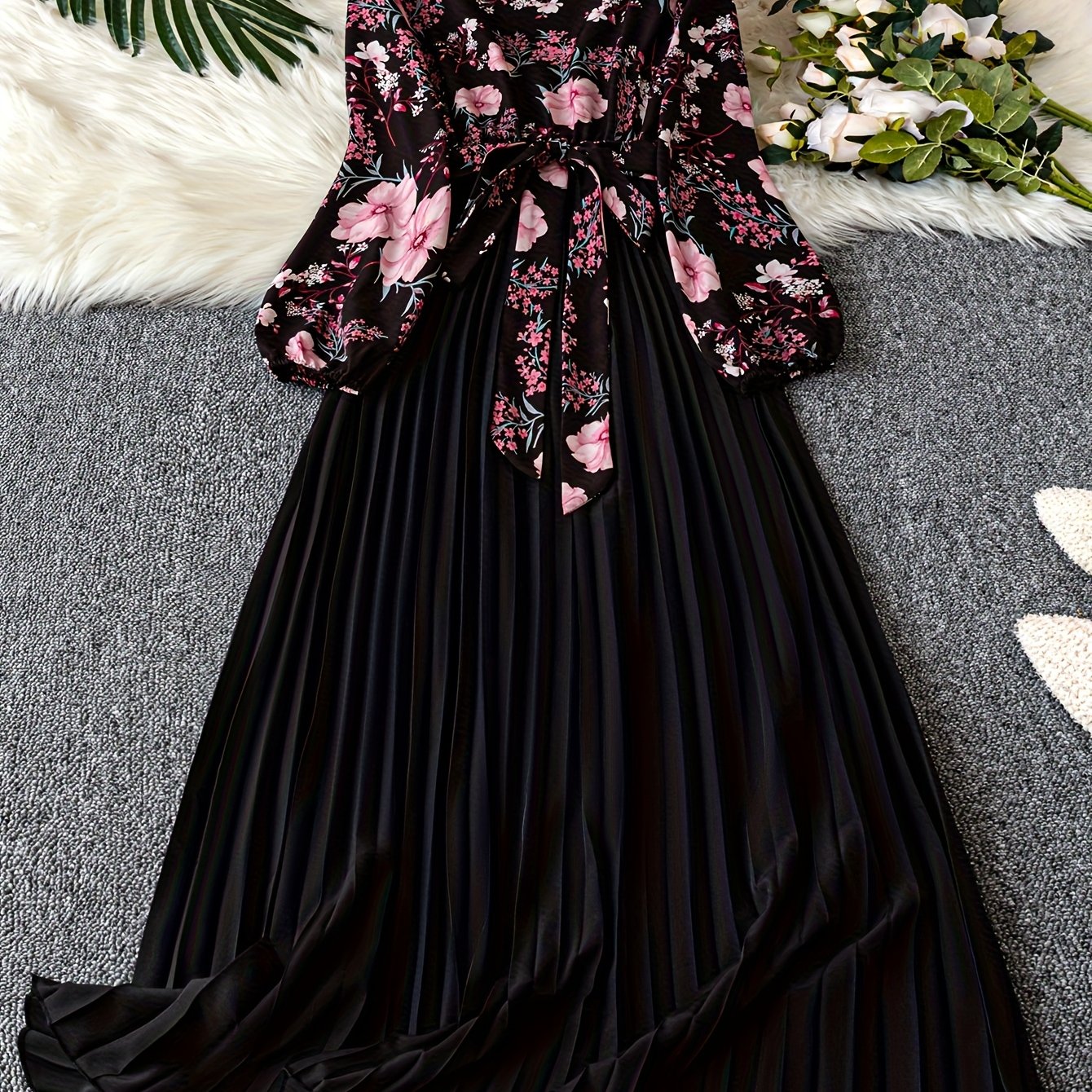 TEMU 플러스 사이즈 여성용 플로럴 프린트 라운드넥 드레스 - 조절 가능한 허리 타이 & 퍼프 소매, 플레어드 헴, 세탁기 사용 가능, 사계절 착용 우아한 스페셜 컬렉션, 긴소매 캐주얼 엘레강스 드레스, 부드러운 원단