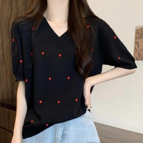 [휴드]하트 도트자수 브이라인 반팔 탑