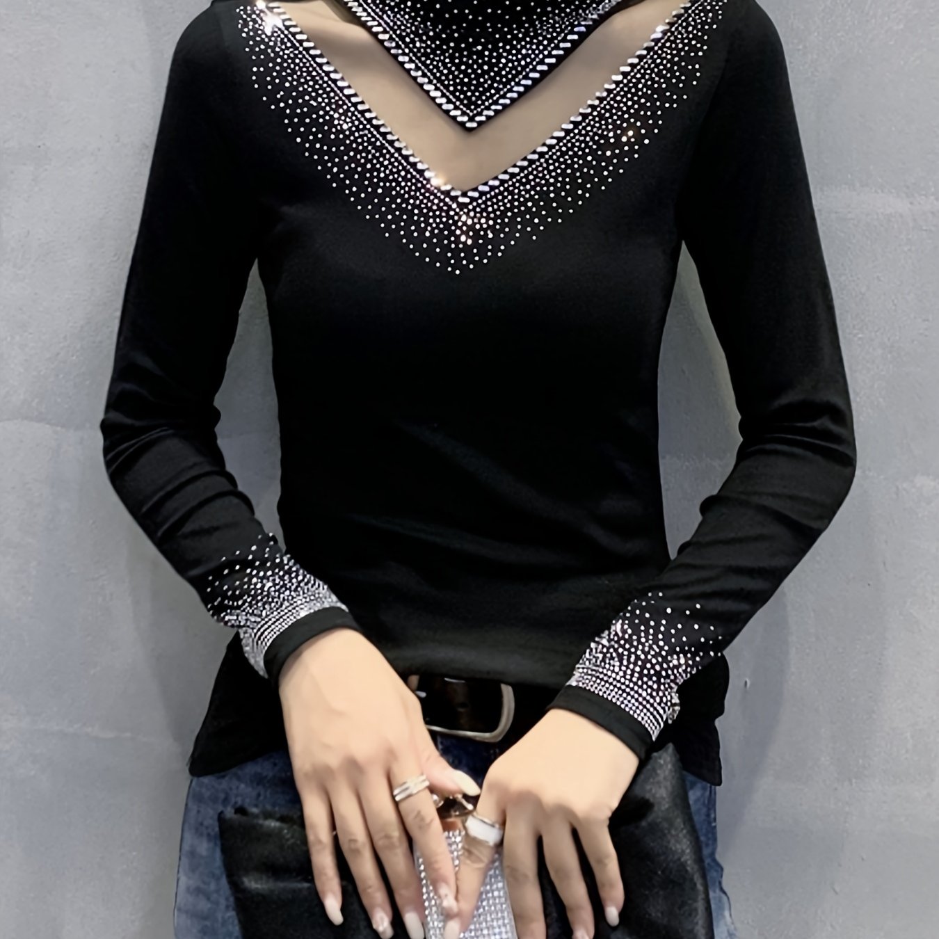 TEMU 1개 라인스톤 메쉬 패치워크 하이넥 긴팔 티셔츠, 패셔너블 섹시 스타일, 핏, 데일리웨어/파티용 다용도 탑