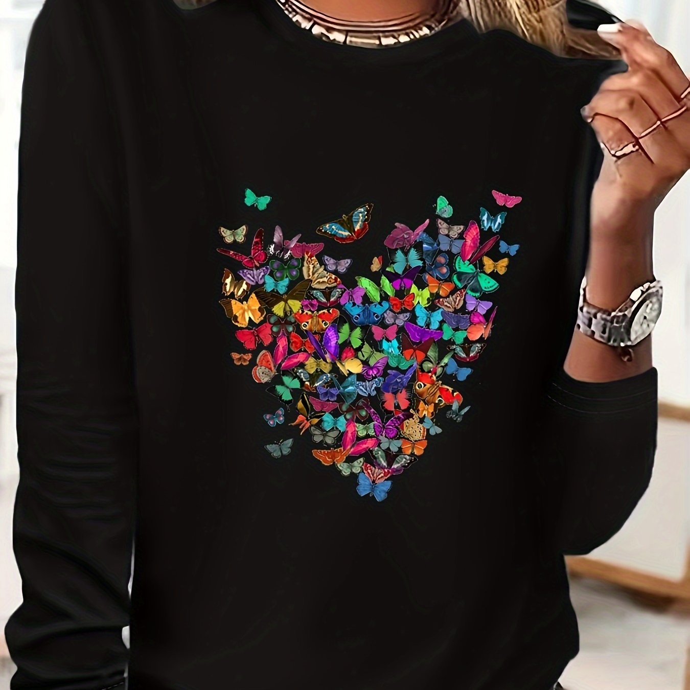 TEMU 나비 하트 프린트 크루 넥 티셔츠, 봄과 가을을 위한 캐주얼 롱 슬리브 상의, 여성 의류