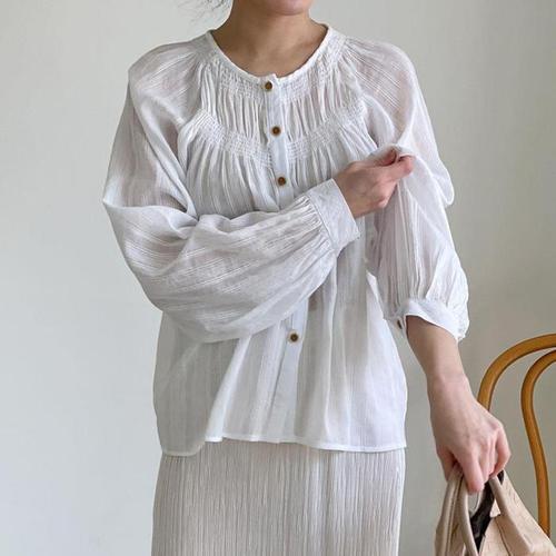 [다잇템]여자 백셔링 스모킹 단추 비침 벌룬 블라우스 (31929468A)