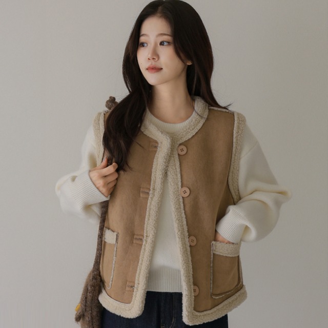 [시크폭스] 루미엘 배색라인 단추 니트 베스트_53KN804