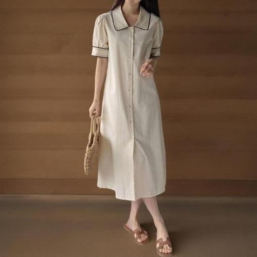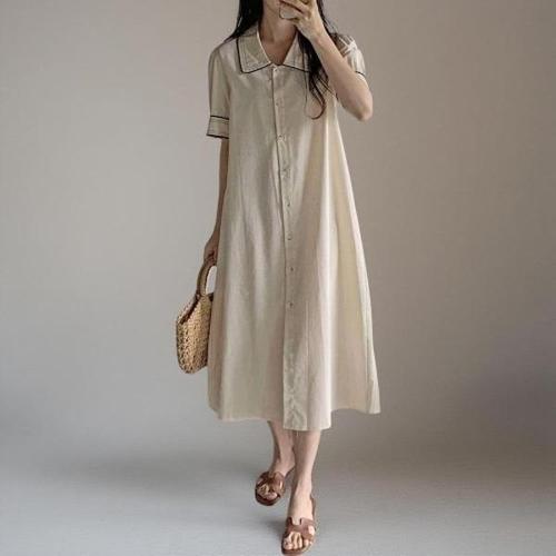 [신상오픈런]|CHO55E0|여성 사랑스러운 스티치 디테일 카라넥 반팔 롱 드레스_21887468_597559