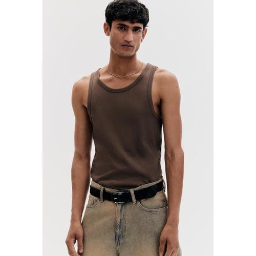 H&M 슬림핏 리브드 슬리브리스 탑 다크 베이지 1227155012