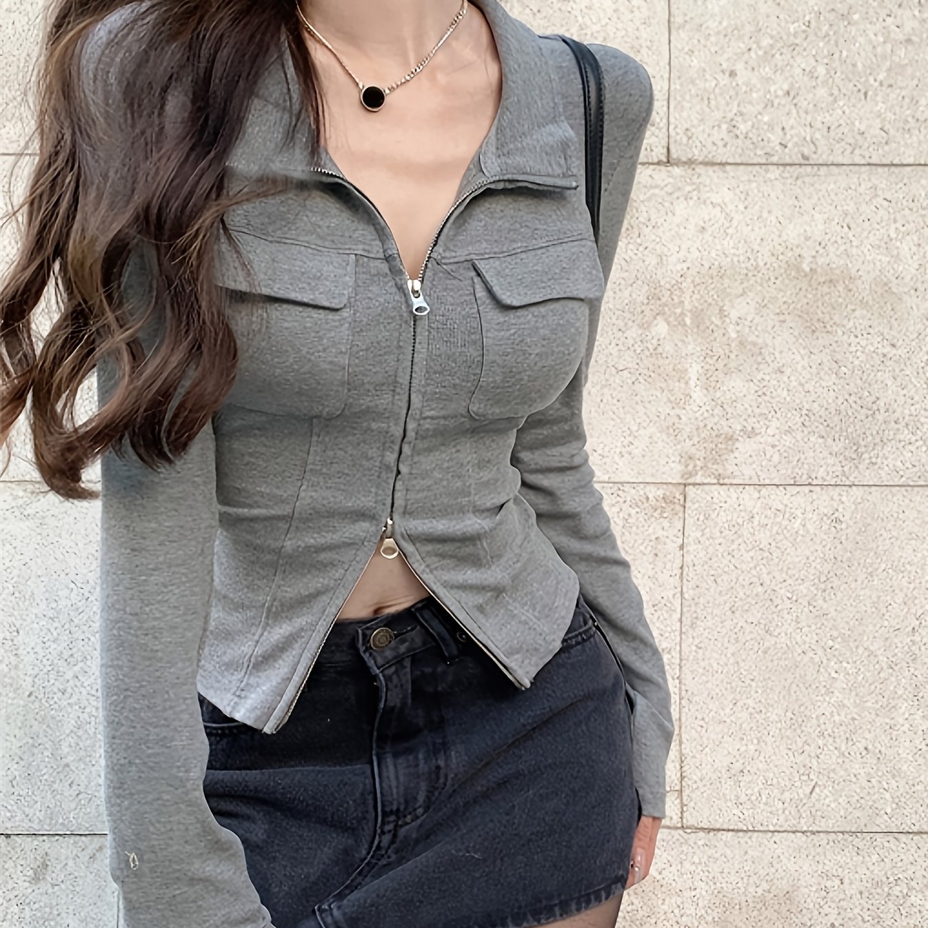 TEMU 여성용 긴팔 폴로 재킷, 핏팅 허리, 이펙트, 더블 지퍼, 듀얼 포켓, 트렌디한 가을/겨울룩에 완벽한 그레이 색상.
