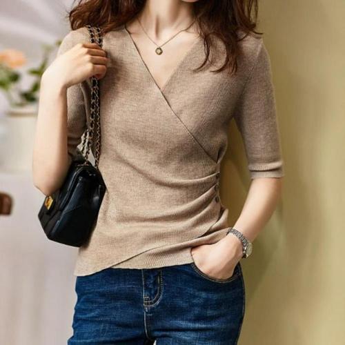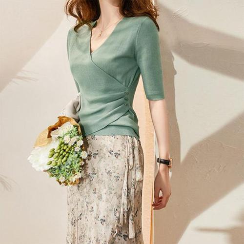 [다잇템]여자 V넥 출근룩 컨템포러리 랩 칠부 니트 (15552918A)