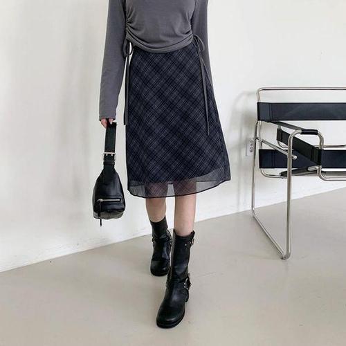 [옷자락] 여성 격자 체크 시스루 뒷밴딩 a라인 미디 스커트