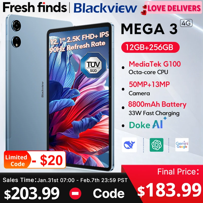 블랙뷰 메가 3 태블릿 12.1인치 2.5K 90Hz 디스플레이 12GB 256GB 8800mAh 50MP 카메라 33W 고속 충전 와이드바인 L1 안드로이드 15 패드 PC