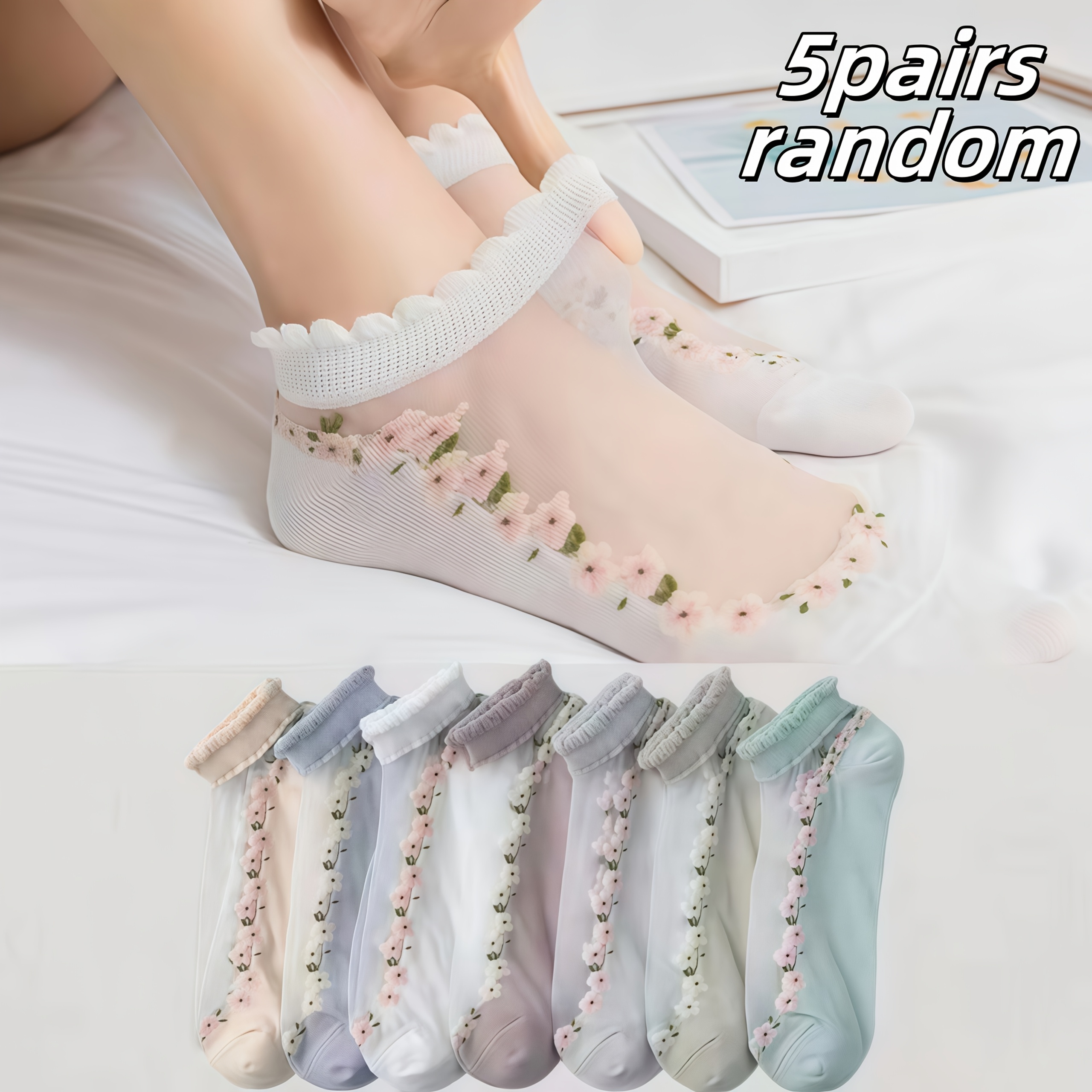 TEMU 꽃무늬 여성용 발목 양말 5켤레 - 숏/노쇼 양말, 데일리웨어, 캐주얼 & 오피스용 - 부드럽고 편안한 양말, 손세탁 가능, 다양한 컬러 옵션