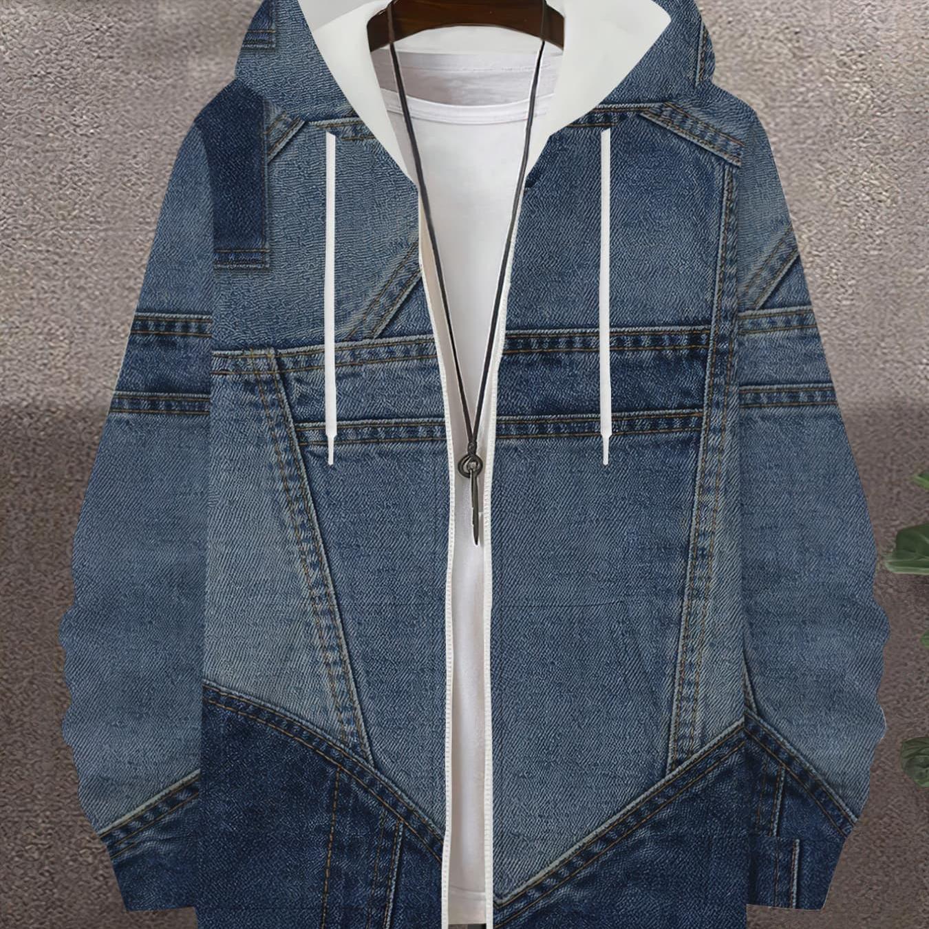 TEMU 남성용 패션 인조 데님 집업 후드티 캐주얼 활용도 높은 트렌디한 스트리트 스타일 가디건 자켓