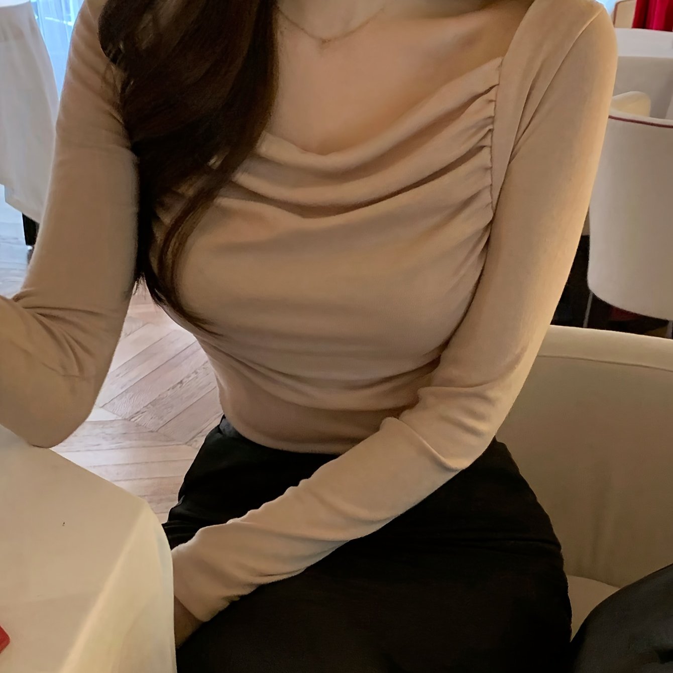 TEMU 여성용 슬림핏 우아한 원숄더/보트넥 셔츠 티셔츠 - 러플 칼라와 긴소매 블라우스, 중간 신축성 사계절용 탑, 세탁기 사용 가능한 솔리드 컬러 아우터웨어|여성블라우스