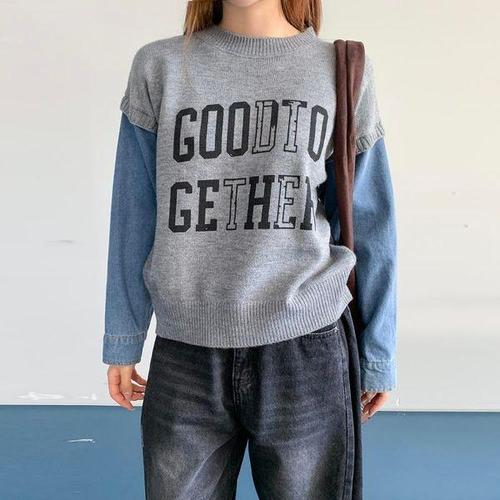 [다잇템]여성 데님소매 키치무드 U넥 박시핏 니트