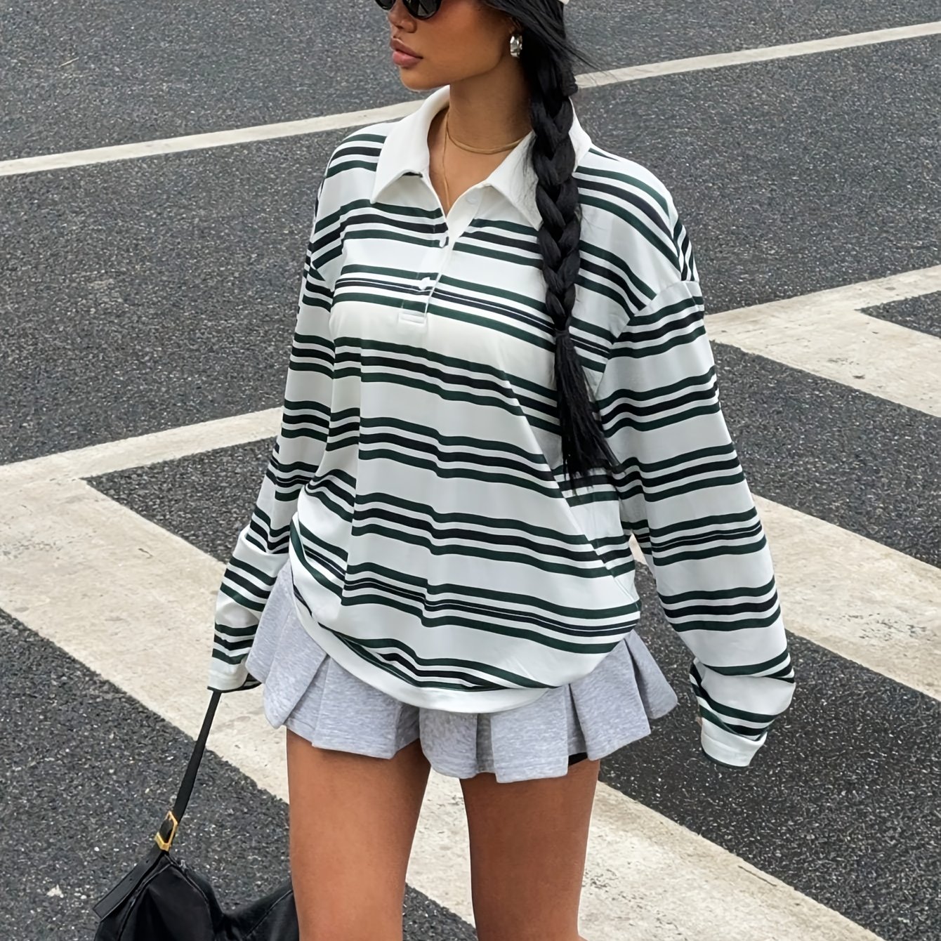 TEMU 여성용 그린 & 화이트 오버사이즈 롱라인 티셔츠 - 긴 소매 버튼 프론트 플라켓, 와이드 레그 밑단, 그린 패턴 (다크 올리브에서 민트) - 캐주얼에서 스마트 워크웨어까지 봄/가을용, 세탁기 사용 가능