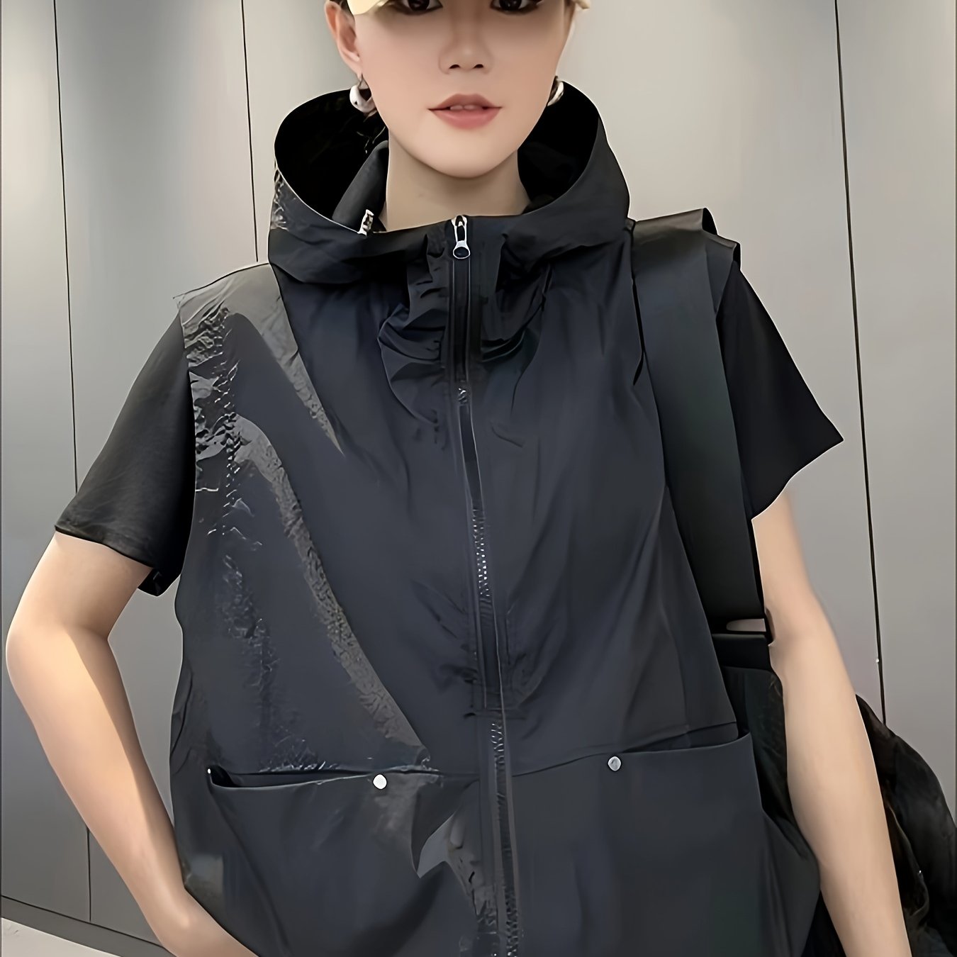 TEMU 단색의 우아한 민소매 조끼, 지퍼업 후드 칼라 재킷과 충전재가 있는 제품입니다.